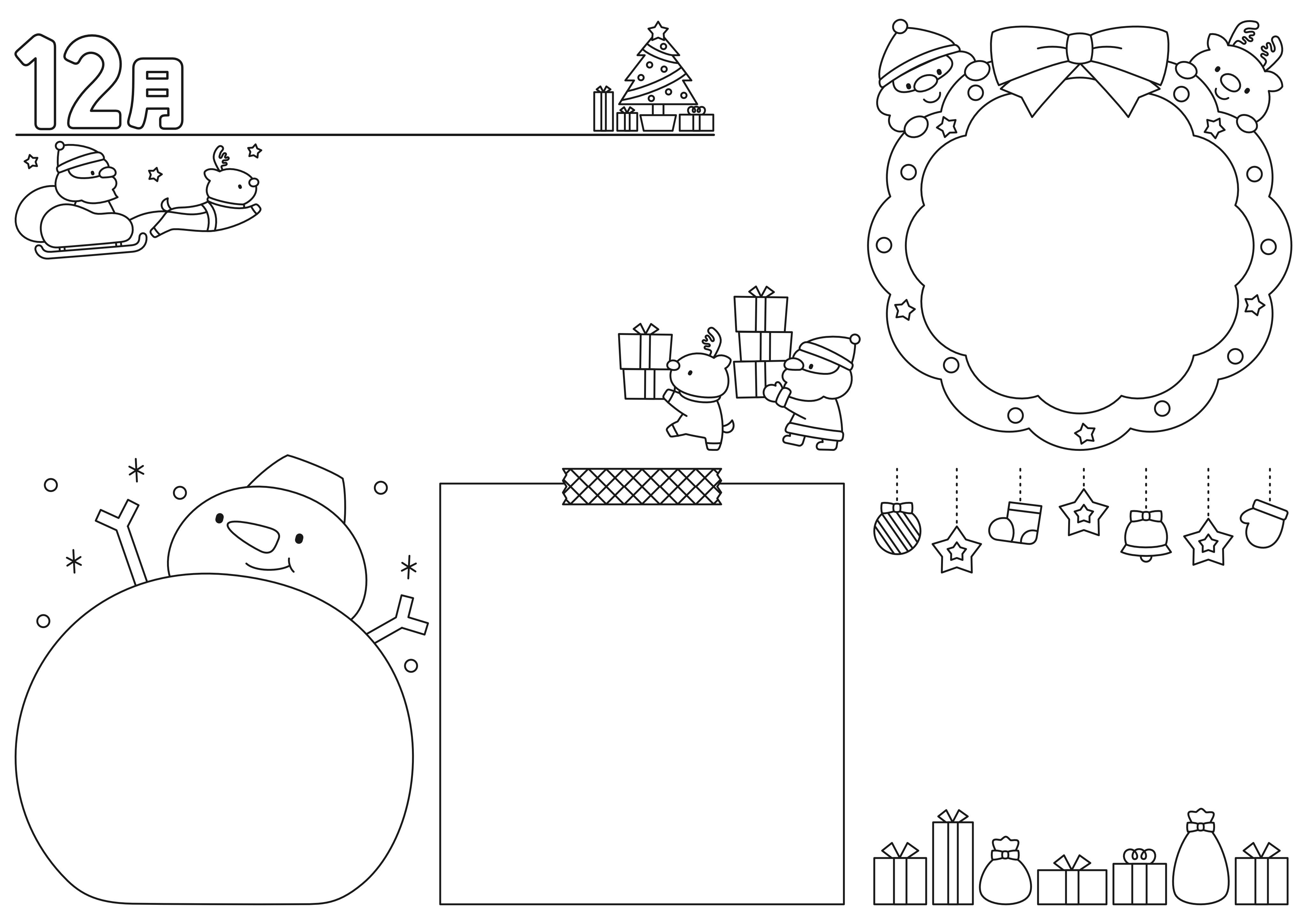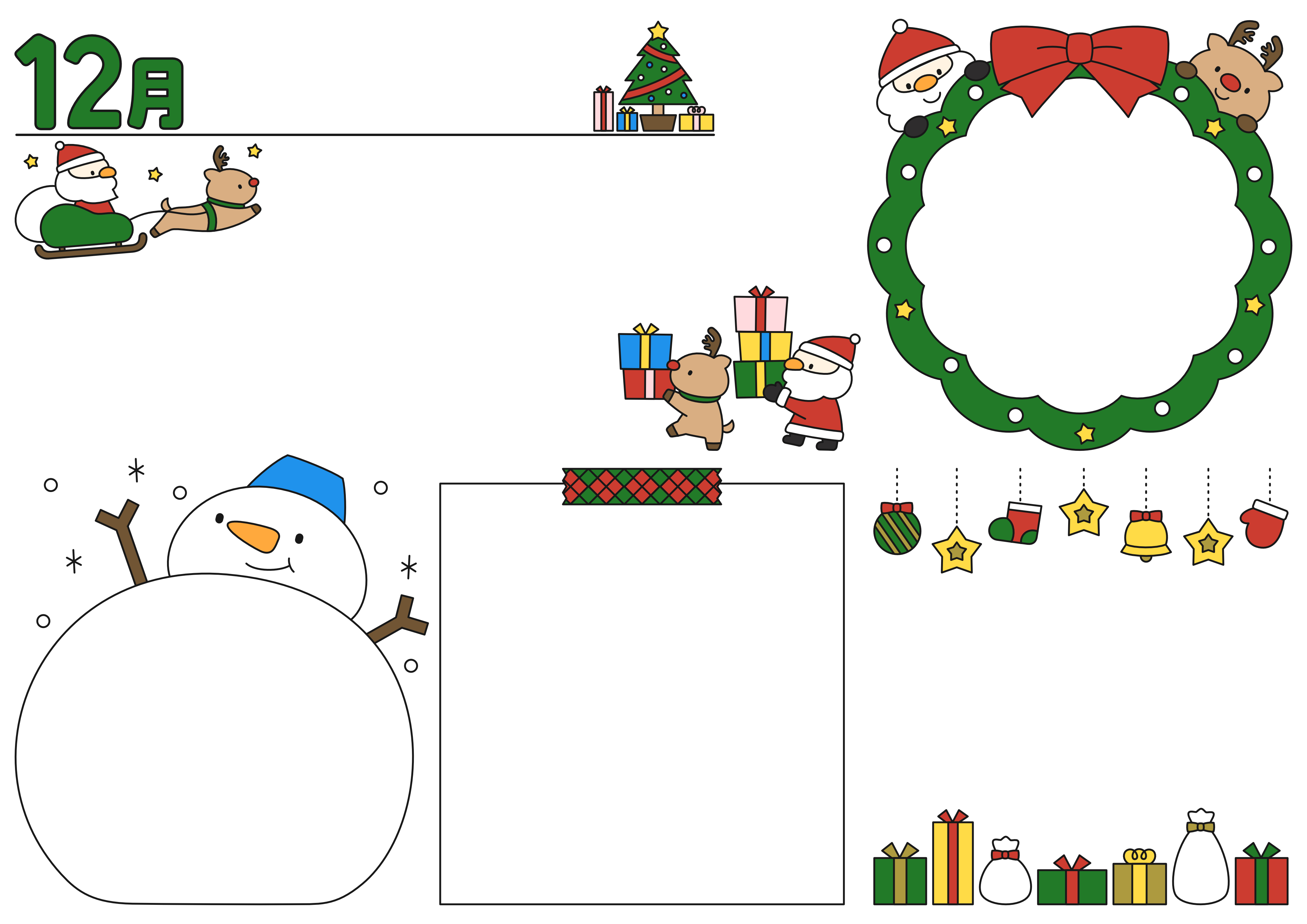 12月のおたよりイラストをぎゅぎゅっと詰め込んで1枚にした、12月おたよりイラストセットです。元々A4サイズにしてあるので、ダウンロードしてそのままWordやExcelなどに貼り付け、テキストボックスを挿入して文字を入れれば、簡単におたよりが作れちゃいます!12月のイラストは、クリスマスが盛りだくさん!タイトルの横にはクリスマスツリー、ゆるくてかわいいサンタさんとトナカイさんのイラストや、クリスマスリースや雪だるまのフレーム、オーナメントやプレゼントのライン素材などクリスマスが楽しみになるイラストを詰め込みました。一つ一つの素材を別で投稿していますので、必要なイラストのみダウンロードしたい方はそちらをご利用ください。縦向きのバージョンもありますので、お好きな方をダウンロードしてくださいね。保育園や幼稚園12月の園だよりに、ぜひお使いください!