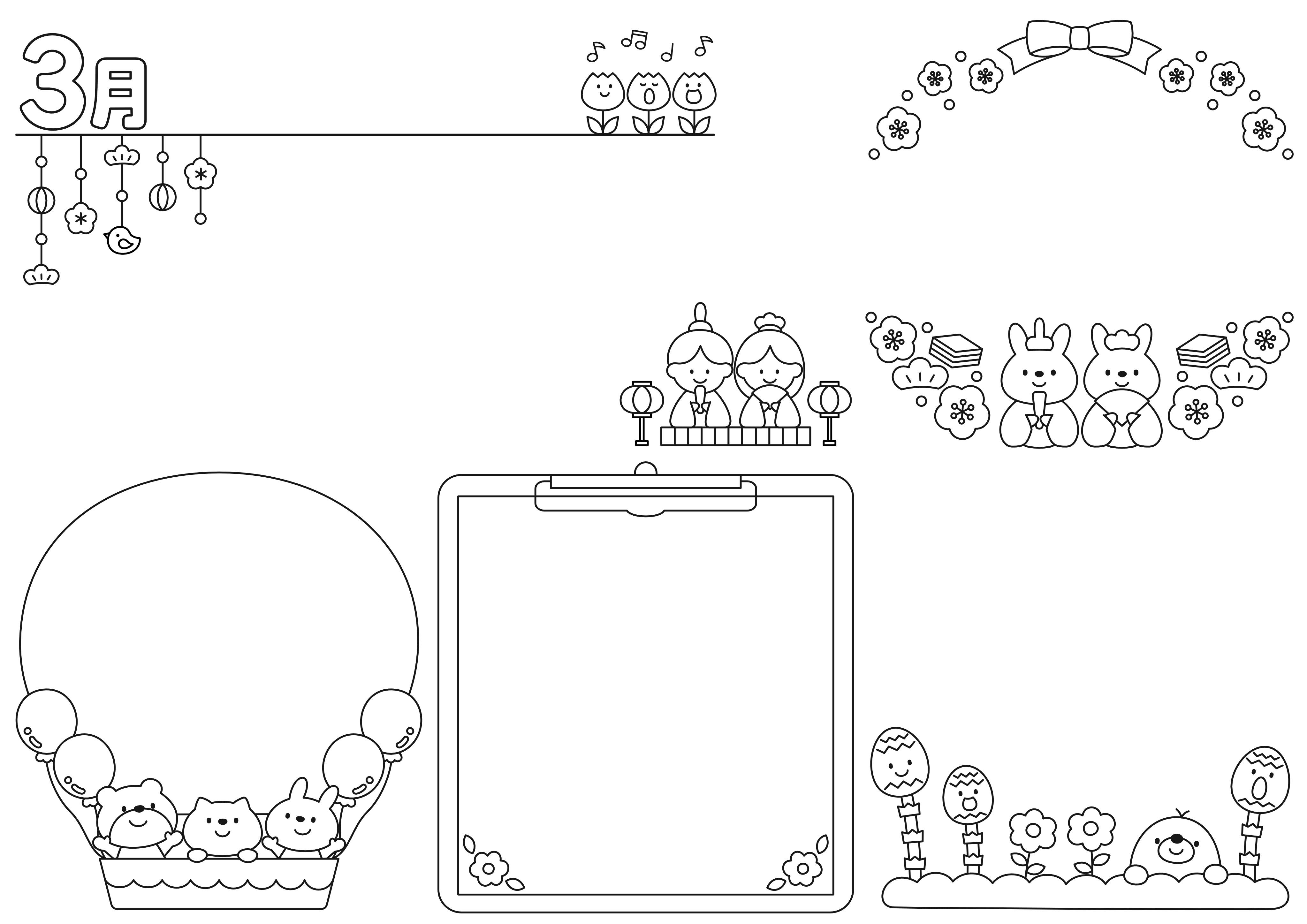 3月のおたよりイラストをぎゅぎゅっと詰め込んで1枚にした、2月おたよりイラストセットです。元々A4サイズにしてあるので、ダウンロードしてそのままWordやExcelなどに貼り付け、テキストボックスを挿入して文字を入れれば、簡単におたよりが作れちゃいます!3月のイラストは、春らしい優しい色合いの、うさぎさんがおひなさまになったフレーム素材や、おひなさまおだいりさまのイラストなどひなまつりに関するのイラストをはじめ、卒園をイメージした気球のフレーム素材や、つくしやお花など春を感じるイラストなど、3月らしいイラストを詰め込みました。一つ一つの素材を別で投稿していますので、必要なイラストのみダウンロードしたい方はそちらをご利用ください。縦向きのバージョンもありますので、お好きな方をダウンロードしてくださいね。保育園や幼稚園3月の園だよりに、ぜひお使いください!